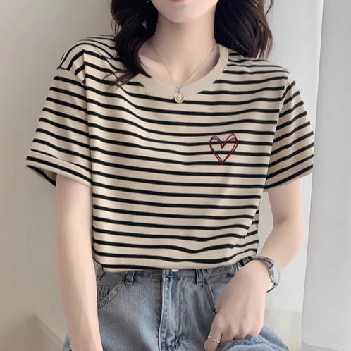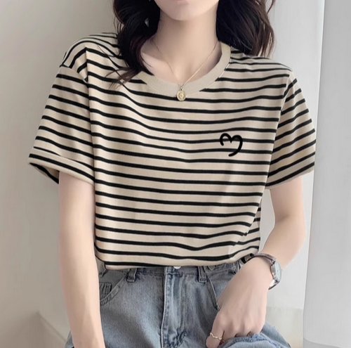 2025新款正肩条纹纯棉短袖t恤女时尚洋气宽松休闲上衣打底衫夏季的描述